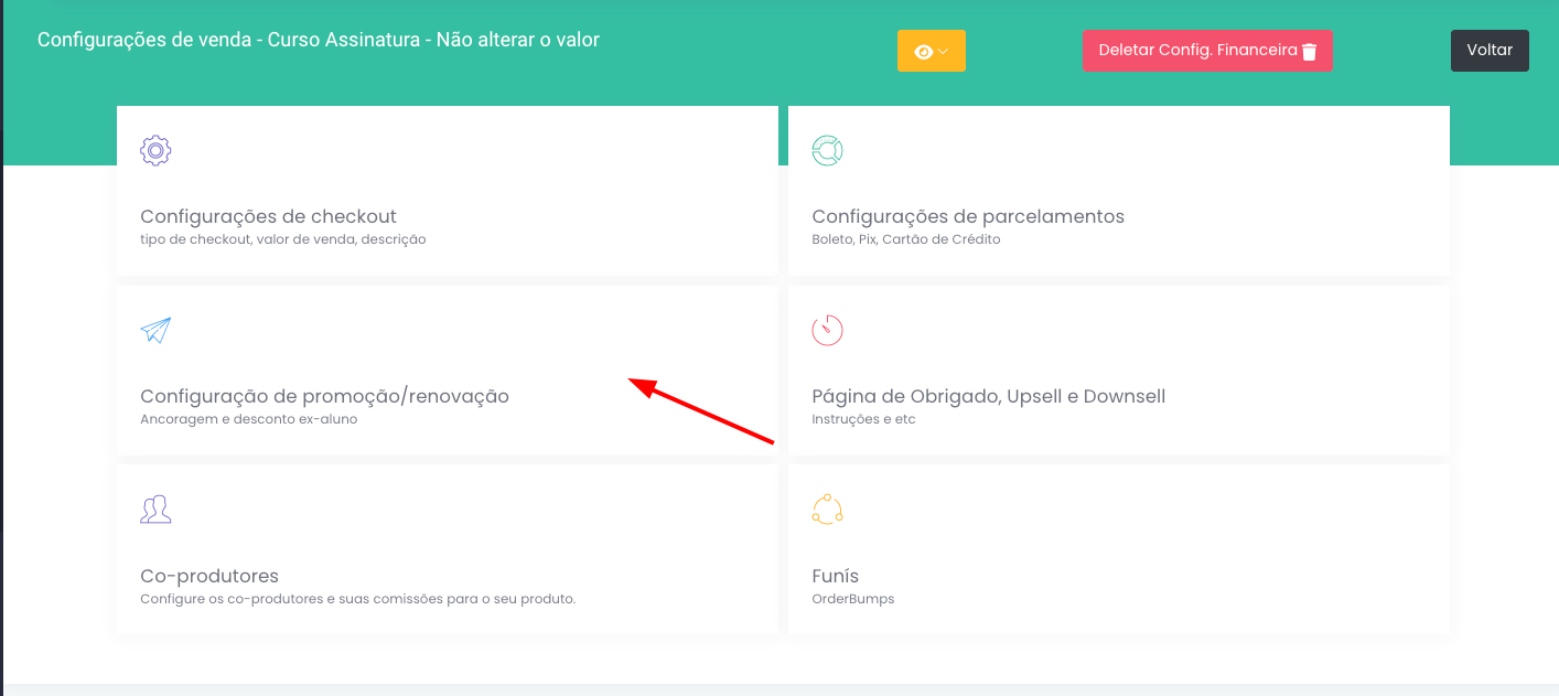 Na configuração financeira do seu produto, o seu checkout precisa ser do tipo ASSINATURA, sendo do tipo assinatura clique na opção Configuração de Promoção/Renovação, nela você uma nova seção chamada degustação.
