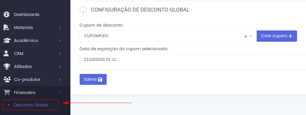 A funcionalidade de Desconto Global permite a criação e gerenciamento de cupons de desconto que podem ser aplicados globalmente em sua plataforma. Essa ferramenta é especialmente útil para campanhas promocionais abrangentes ou para oferecer descontos gerais para os usuários.