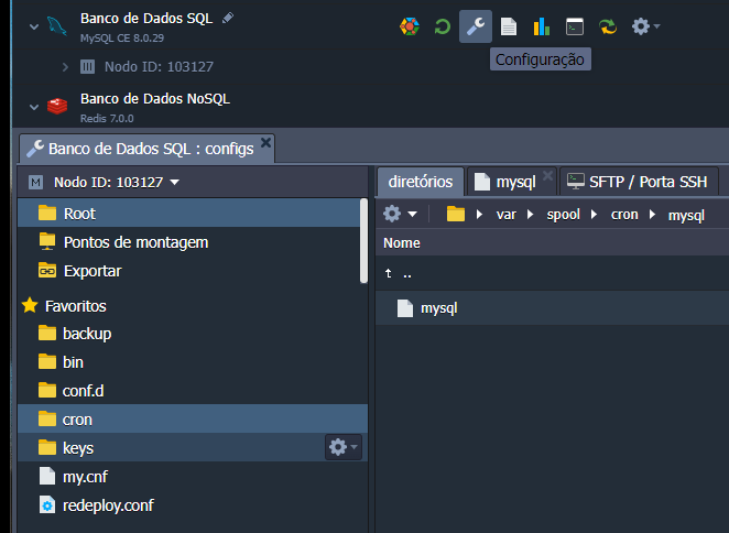 Após os passos anteriores chegamos na fase final de configuração, aqui precisamos criar um comando cron para rodar o dump do Banco de Dados, no servidor do banco clique em configurações, após isso acesse a pasta “cron” e na sequencia clique no arquivo mysql (segue imagem de exemplo):