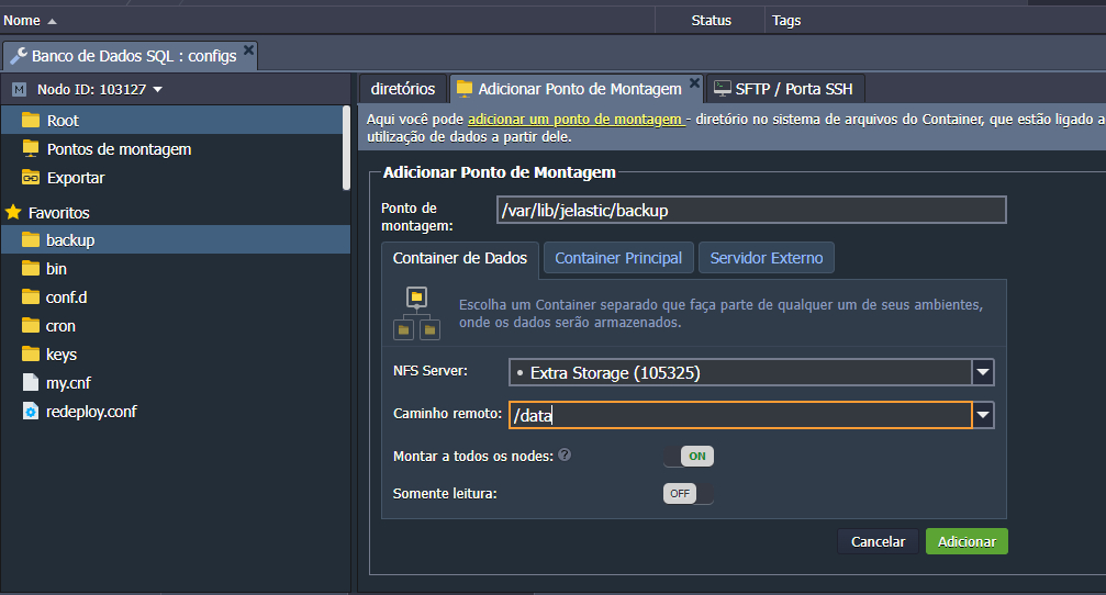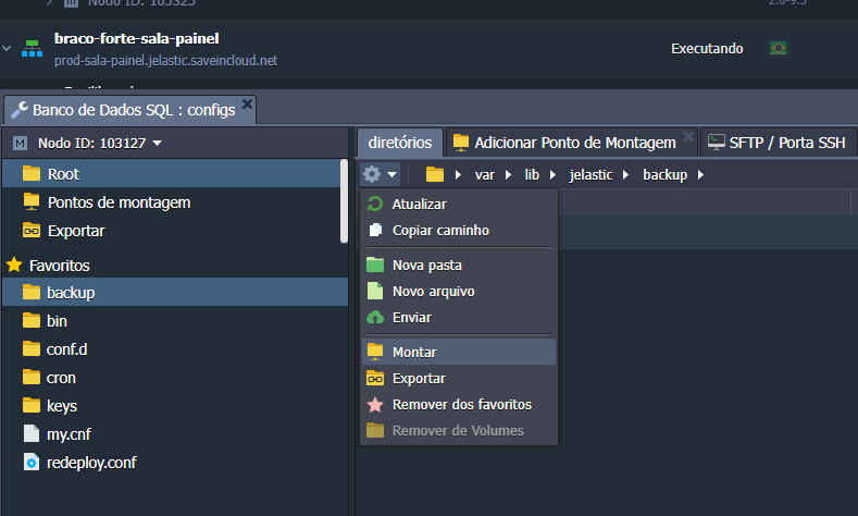 Após criado o ambiente de armazenamento, precisamos apontar nosso backup para ele, para isso devemos ir no ambiente principal do nosso banco de dados, clicar em configurações e ir até a pasta de “backup”, selecione a pasta de backup e clique em configurações, logo em seguida selecione a opção “Montar” (segue imagem de exemplo):