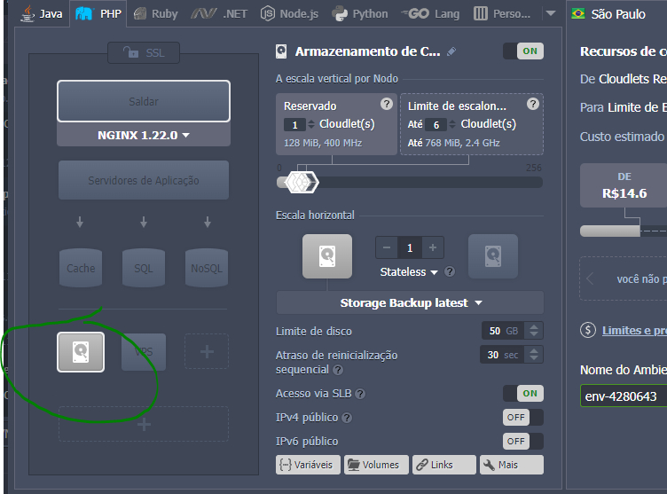 Este ambiente terá apenas uma opção de armazenamento, segue imagem de configuração: