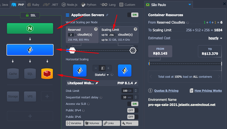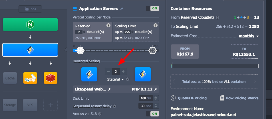 O ambiente obrigatoriamente precisa ter um nginx para balancear, após isso adicionamos mais nós de lightspeed/apache, conforme imagem abaixo:.