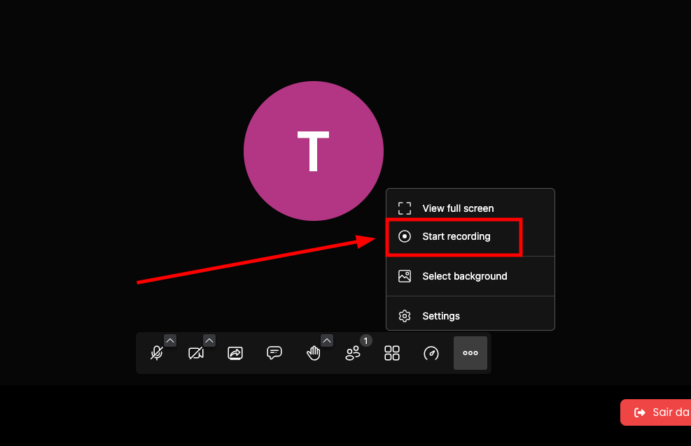 Para iniciar a gravação, clique no botão de... (mais opções)e selecioneIniciar gravação.A gravação éilimitadaem todos os planos pagos.Após o término da reunião, os arquivos de gravação ficam disponíveis automaticamente no painel da EduStore.