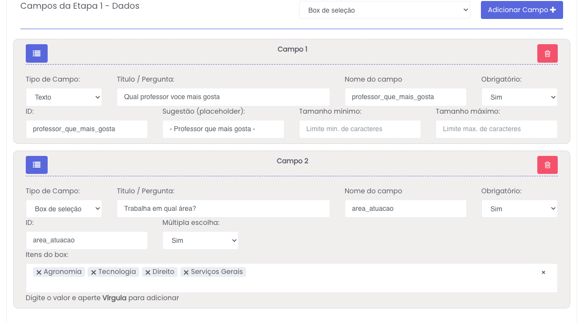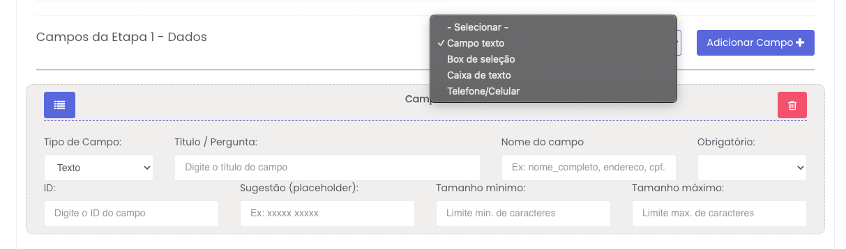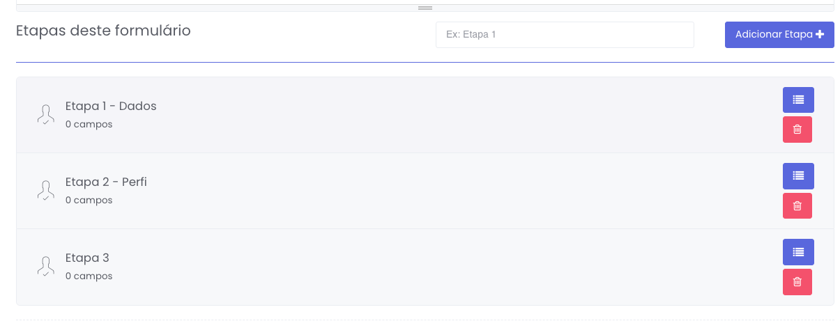 Após cadastrar as etapas, você poderá reordena-las ou remove-las, ao clicar nas etapa, iremos para a criação dos campos de cada etapa.