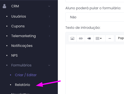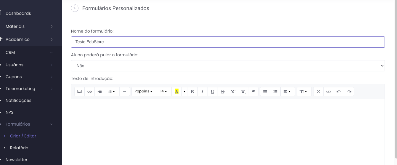 Após finalizar a criação dos campos, basta salvar e ir nos cursos que você deseja (Acadêmico / Cursos) e ao editar o curso terá o campo Formulário, basta selecioná-lo.