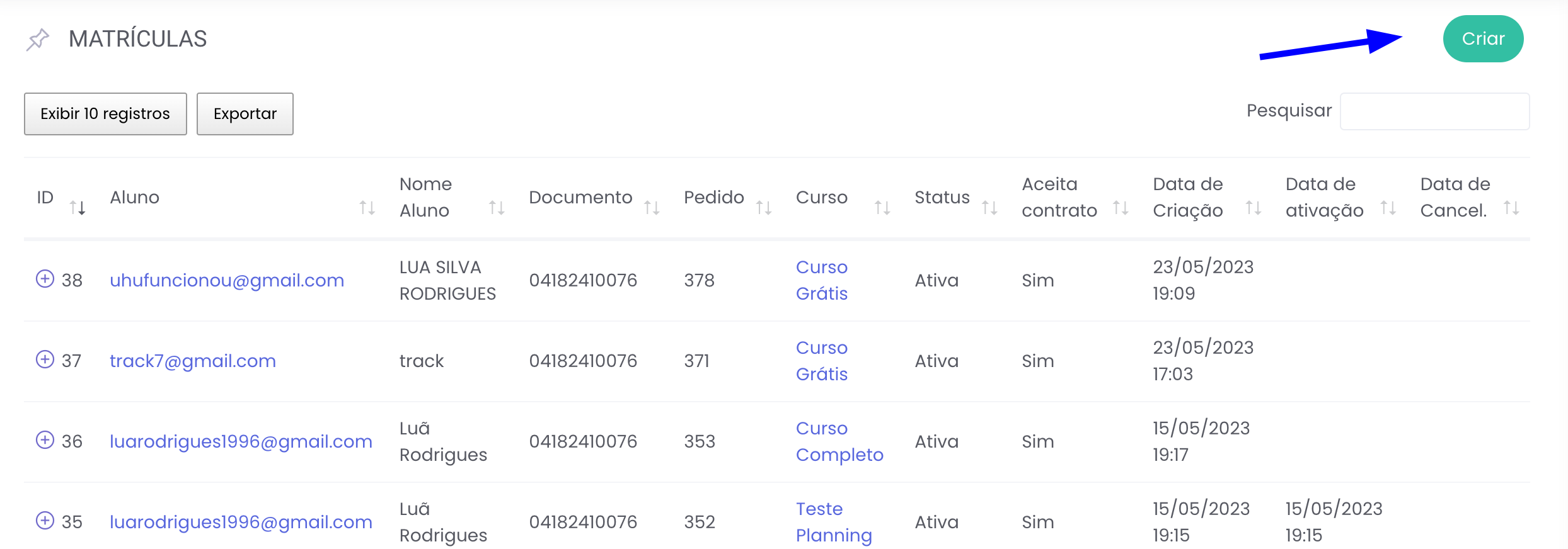 Para a criação de uma matrícula, acesse Acadêmico/Matrículas, aparecerá a lista de matrículas recentes e no canto superior direito um botão 🟢 criar