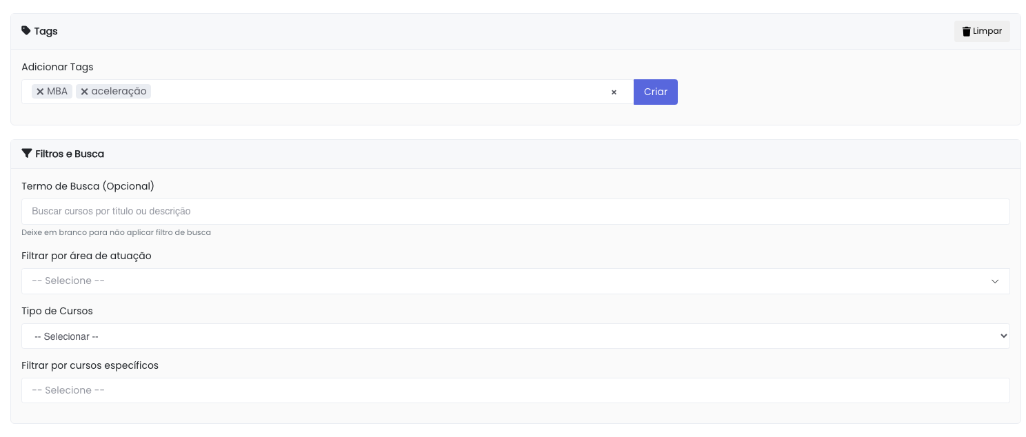 Filtros: Tags, áreas de interesse, produtos específicos, etc.