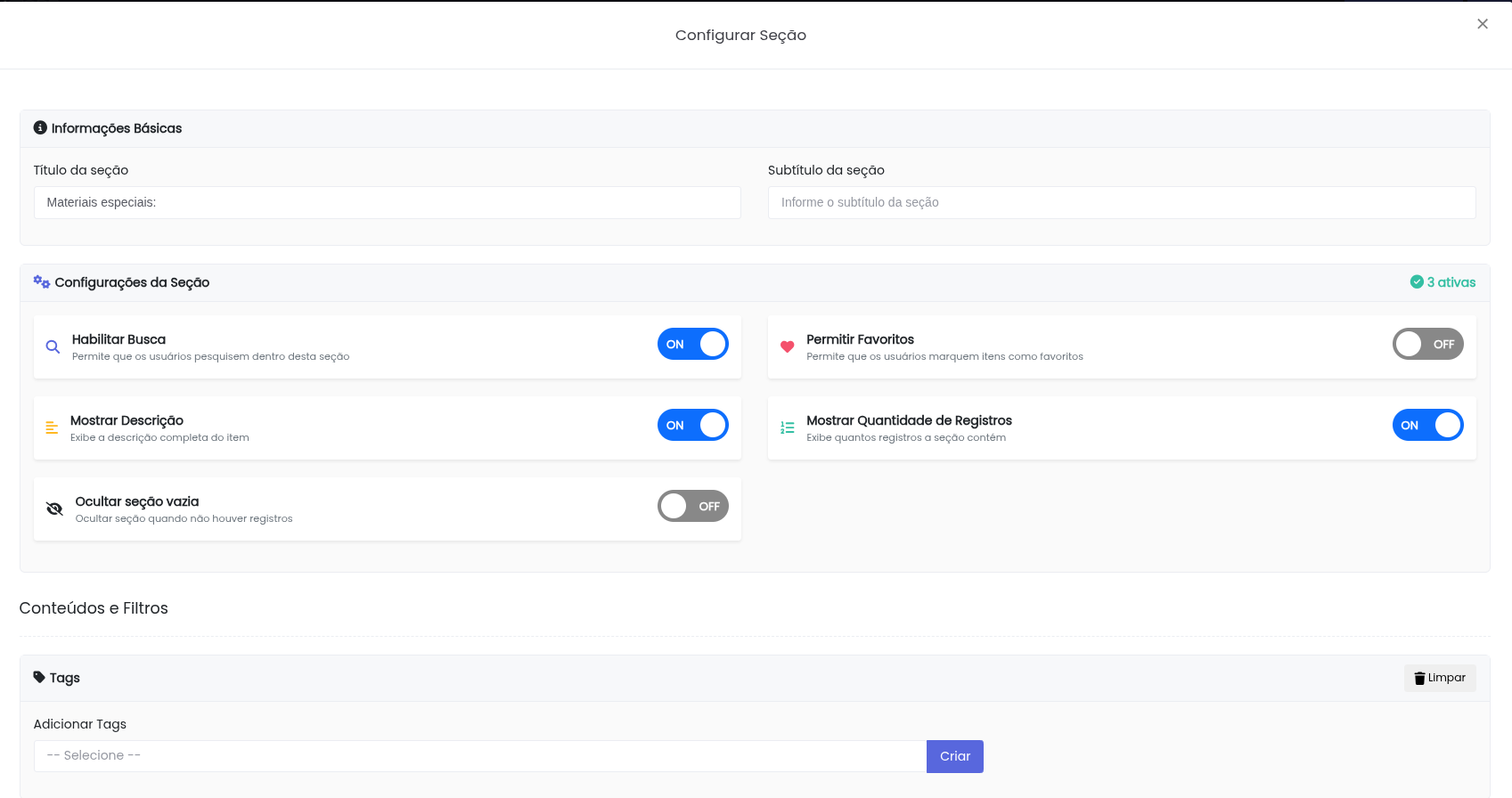 • Ocultar seção vazia: Oculta a seção se não houver conteúdos disponíveis.