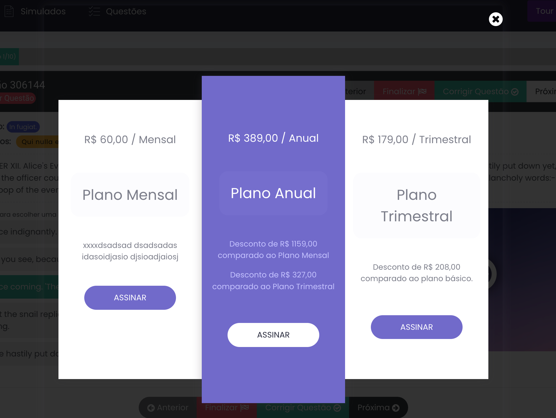 Após os planos configurados corretamente, o aluno, após corrigir a questão poderá clicar para assistir o vídeo resposta, nesse momento já aparece um botão discreto no modal, apontado para os planos: