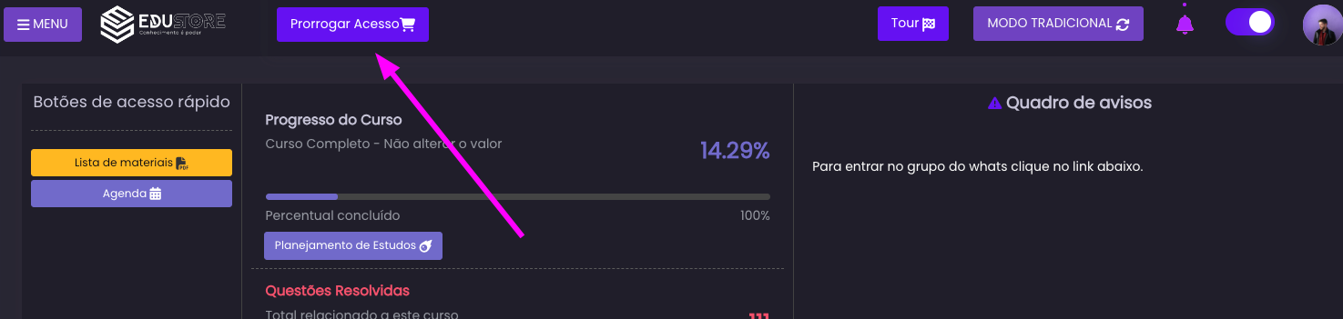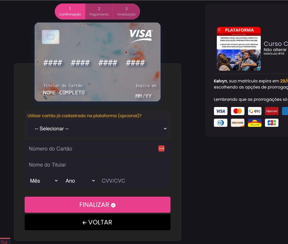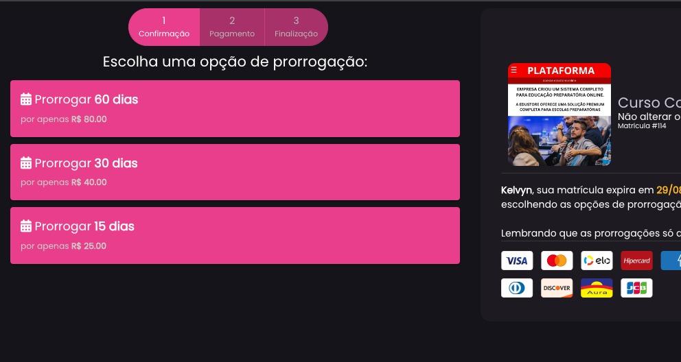 Ao clicar no botão prorrogar acesso ele vai para um checkout focado na conversão de prorrogações, permitindo pagamento via Pix ou Cartão de Crédito à vista.