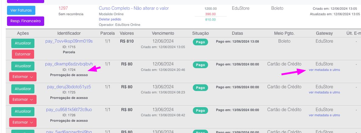 Além disso, na listagem de parcelas dentro do perfil do aluno é possível ver o que é identificado também o tipo de transação e em ver metadata/utms você consegue ver o tipo de prorrogação e valor escolhidos naquele momento.