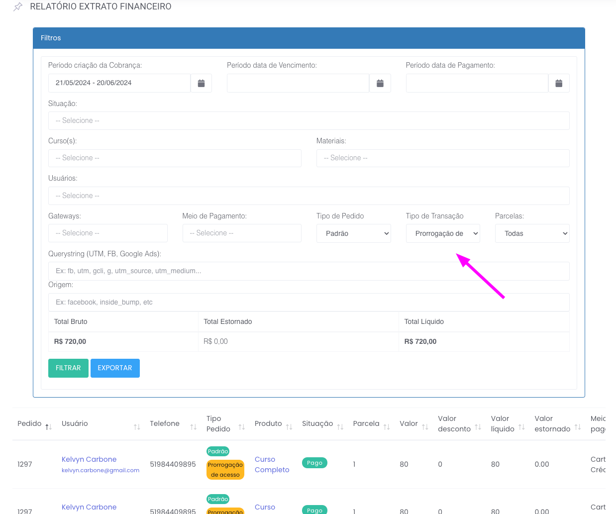 As prorrogações aparecerão no relatório em Financeiro/Relatórios/Extrato Financeiro: