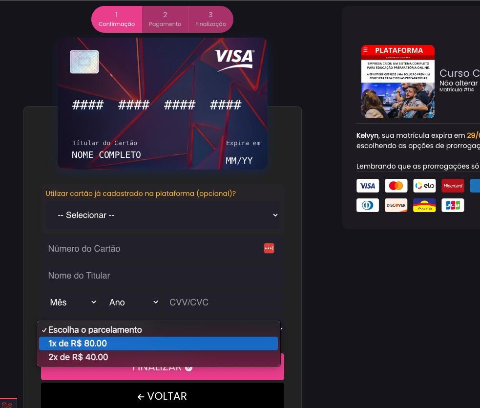 2 - Quando o aluno selecionar a quantidade de dias, será direcionado para uma nova tela onde o cartão escolhido por ele será exibido. Nesta tela, se o período selecionado for superior a 30 dias, será apresentada a opção 'Escolha de parcelamento'.