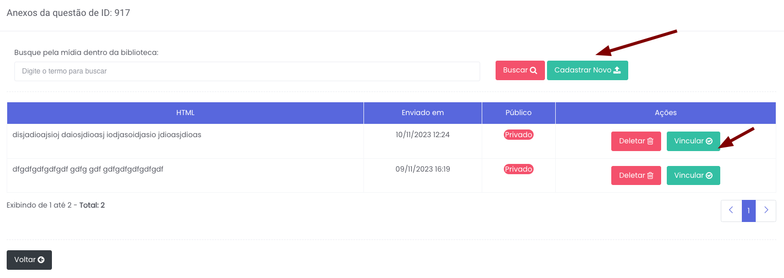 Clicando em anexar conteúdo (HTML) você vai para a biblioteca de conteúdos para anexar em questões, nessa página você pode selecionar um conteúdo existente ou criar um novo.