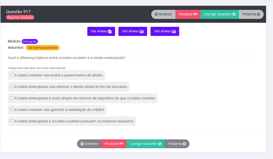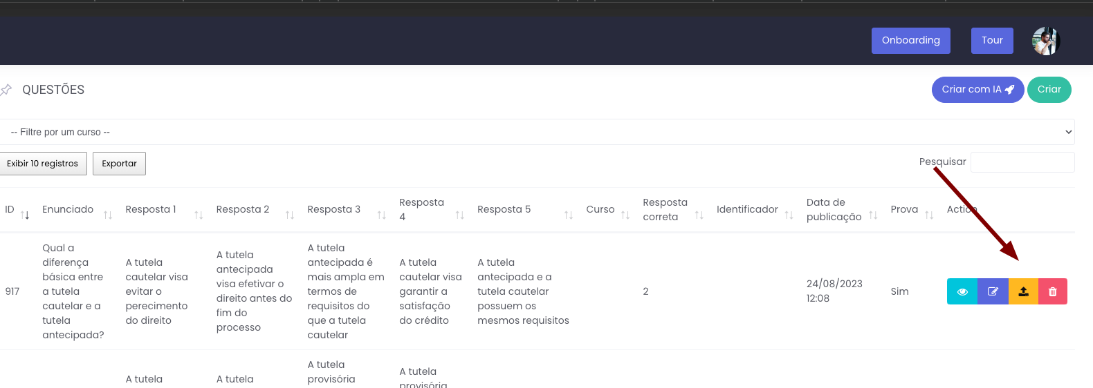 Em Acadêmico / Conteúdos / Questões, na listagem de questões ou na edição de uma questão você verá um botão amarelo com o ícone de upload, referente aos anexos da questão.