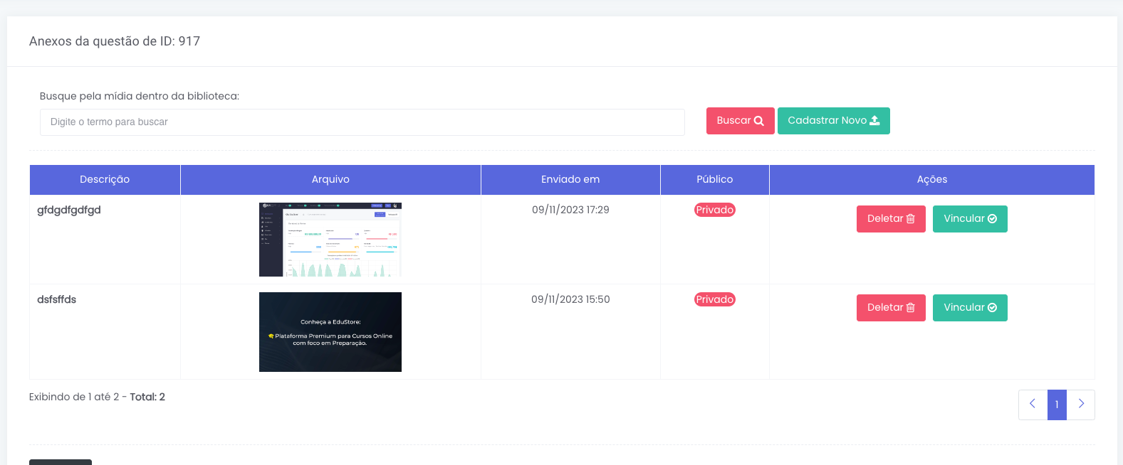 Clicando em anexar imagem você vai para a biblioteca de imagens para anexar em questões, nessa página você pode selecionar uma imagem existente ou subir uma nova.