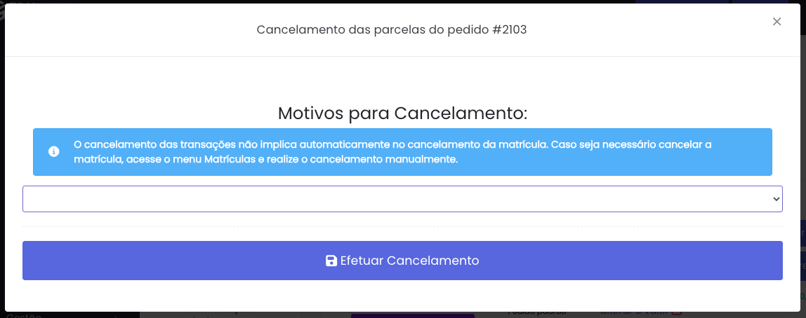Essa seleção é obrigatória para manter o histórico financeiro claro e auditável. Ao finalizar, basta clicar em "Efetuar Cancelamento".