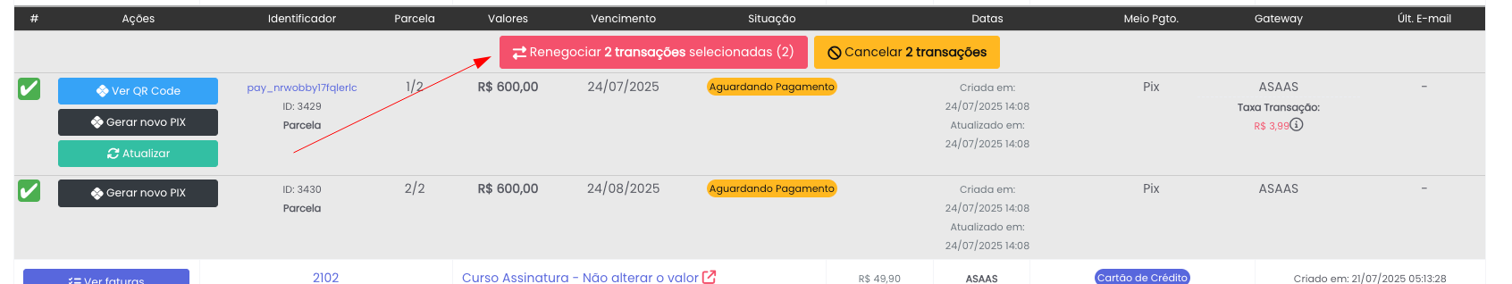Ao acessar o perfil do usuário e ir até a aba “Pedidos”, localize o pedido desejado. Ao lado dos botões de Ações, você verá um checkbox que permite selecionar as transações para renegociação ou cancelamento.