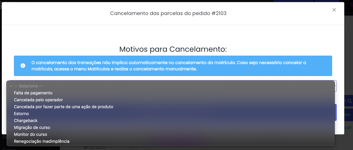 Nesta imagem temos todos os motivos disponíveis para cancelamento.