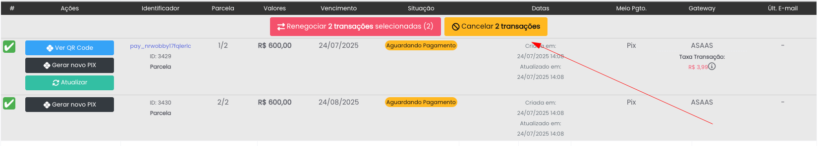 Esse botão só será habilitado após marcar os checkboxes das parcelas desejadas. Ele permite realizar cancelamentos em lote.