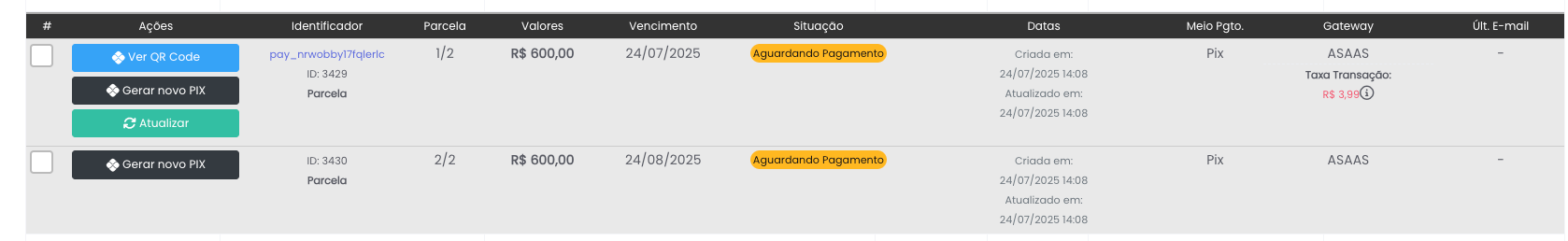 Esse botão registra a nova transação no sistema, atualiza o status do pedido e gera as novas parcelas com as condições definidas.
