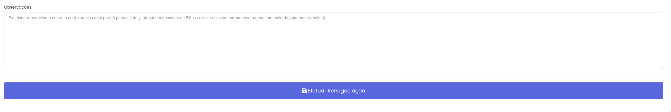 O campo de observações é essencial para registrar o contexto da renegociação. Ele deve ser utilizado sempre que for realizado um acordo com o aluno, pois: