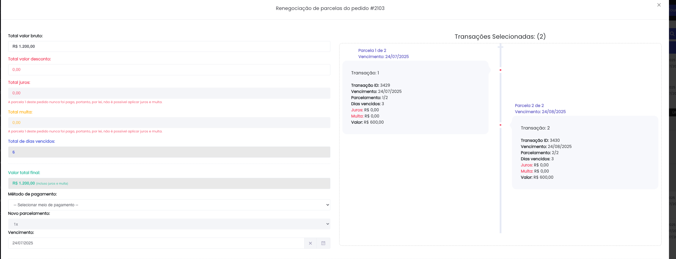 Obs.: Se a transação nunca foi paga, não é permitido aplicar juros (mensagem explicativa será exibida).