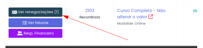 A funcionalidade de renegociação de transações permite reestruturar débitos pendentes dos alunos, ajustando parcelas, prazos e valores de forma personalizada. Ideal para situações em que o aluno precisa de novas condições de pagamento.