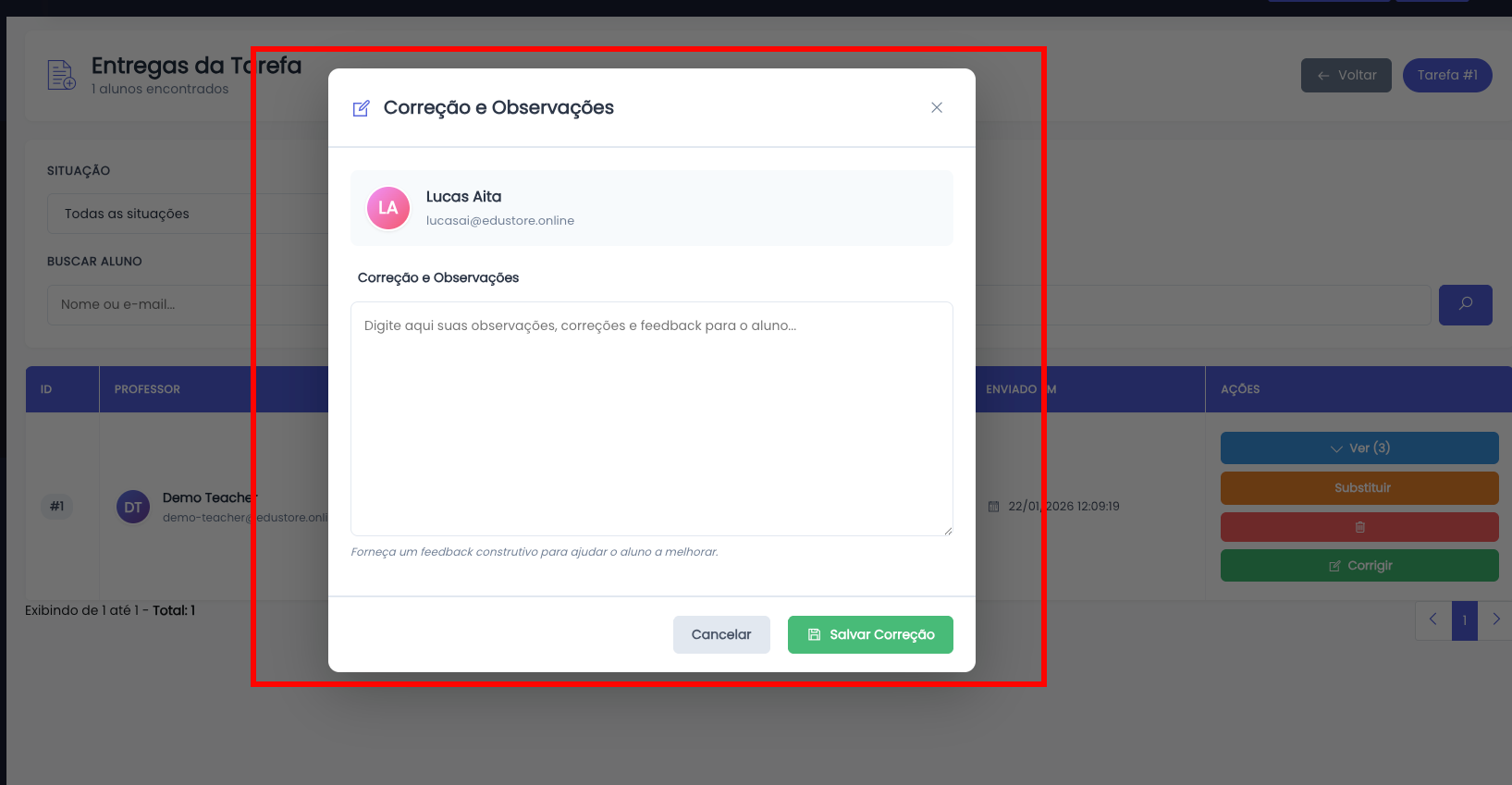 - Função: Abre o modal para o professor/tutor corrigir, colocar observações e dar o feedback da atividade para o aluno