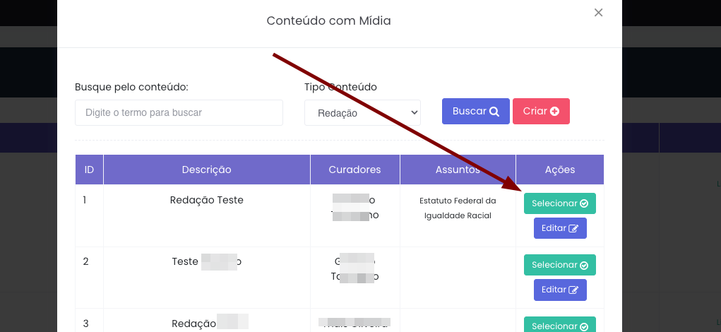 Em Acadêmico / Conteúdos / Tarefas, você terá a lista de redações do sistema