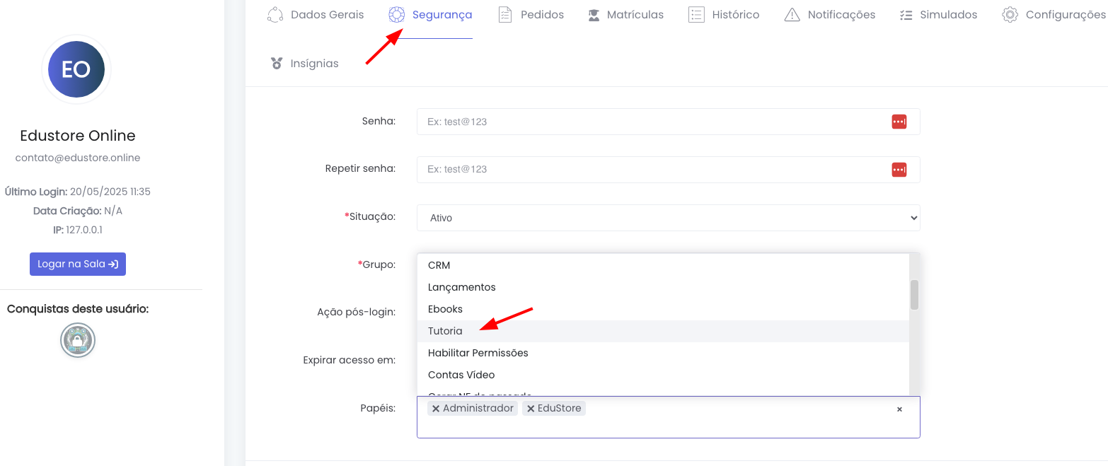 Se você possui professores cadastrados no sistema e eles serão os responsáveis pela tutoria dessas redações, basta você editar os usuários deles em CRM / Usuários e na aba segurança adicionar o papel TUTORIA.
