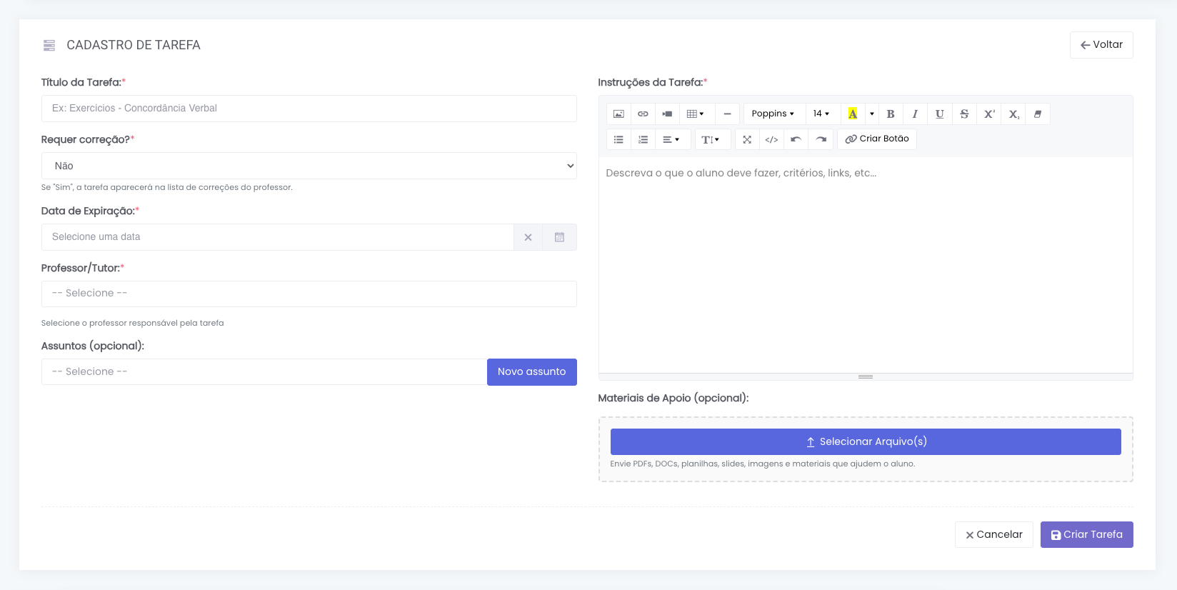 - Data de Expiração da Tarefa (Após essa data ninguém poderá mais enviar): Obrigatório