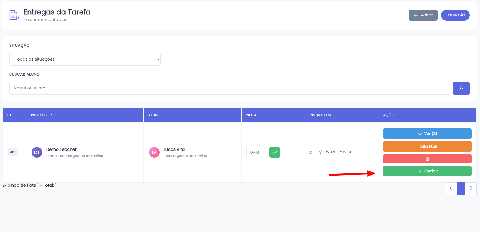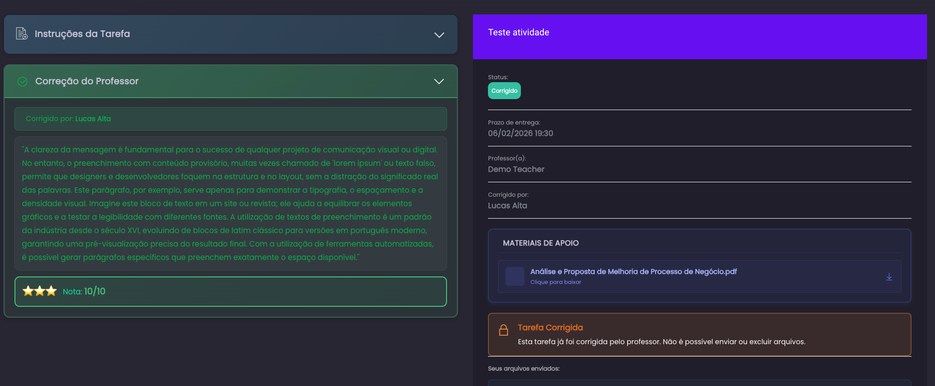 - ⚠️ Atenção: Ao marcar como corrigido, aluno não pode subir mais atualização nos seus arquivos, tais como lançar novos documentos ou excluir "errados".