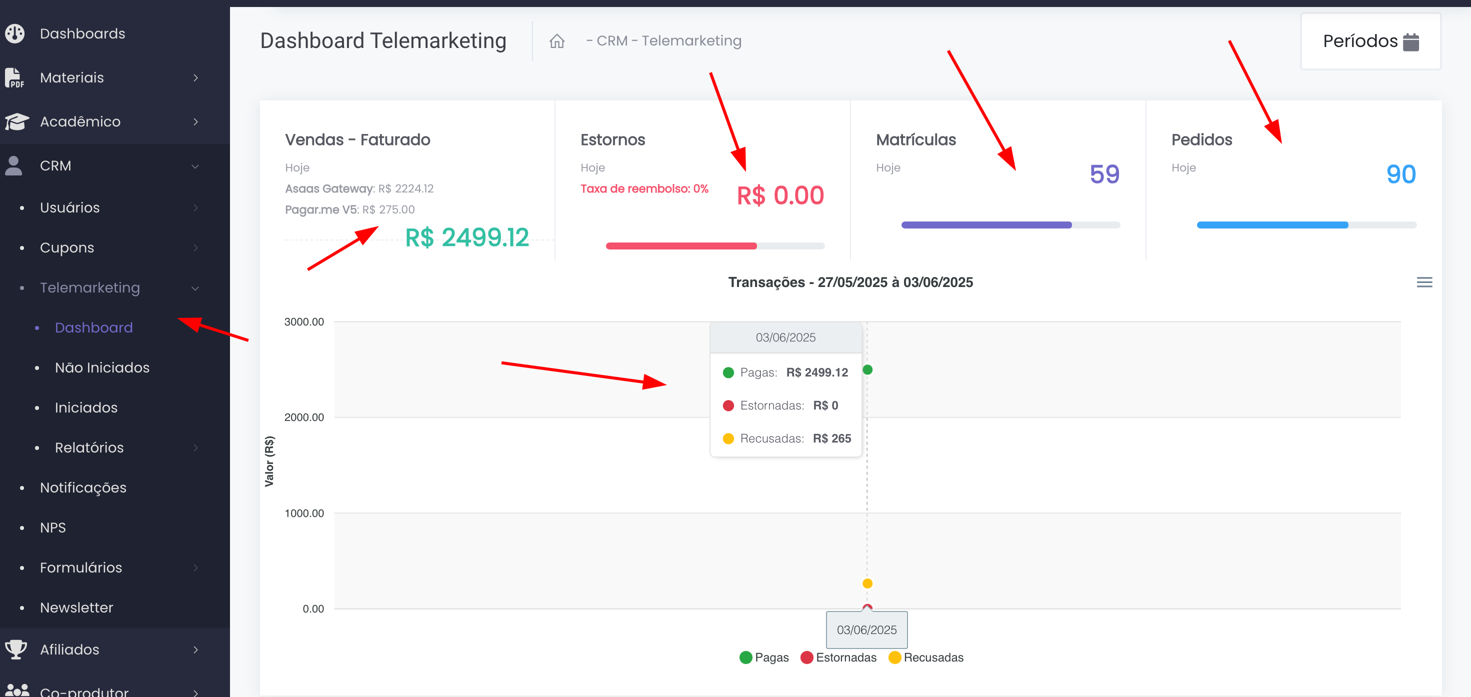Devido a essa necessidade criamos a permissão de acesso a uma dashboard de CRM muito completa para que o gestor ou coordenador tenha controle e visão dos resultados.