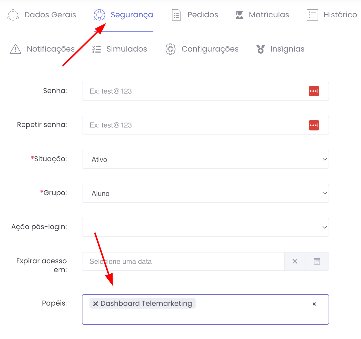 Vá em CRM / Usuários, edite o usuário do grupo colaborador que deseja atribuir o papel. Na aba segurança, no campo papéis, busque por: Dashboard Telemarketing, conforme imagem abaixo.