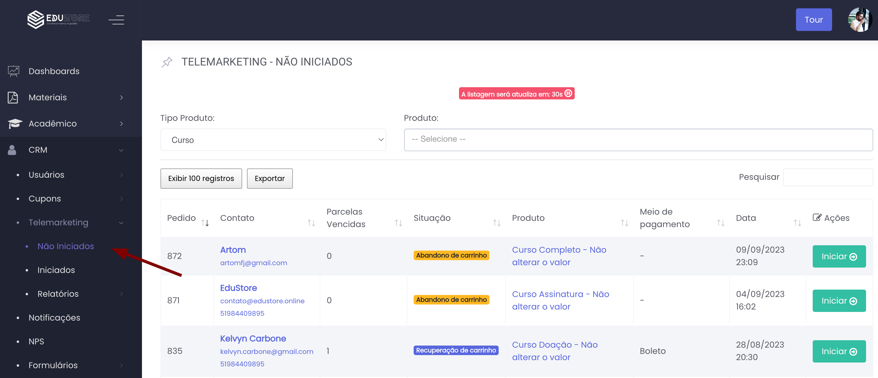Em CRM / Telemarketing você terá 2 opções: Não iniciados e Iniciados, não iniciados são os casos em que nenhum atendente ainda iniciou contato, após iniciar o atendimento ele vai para iniciado.