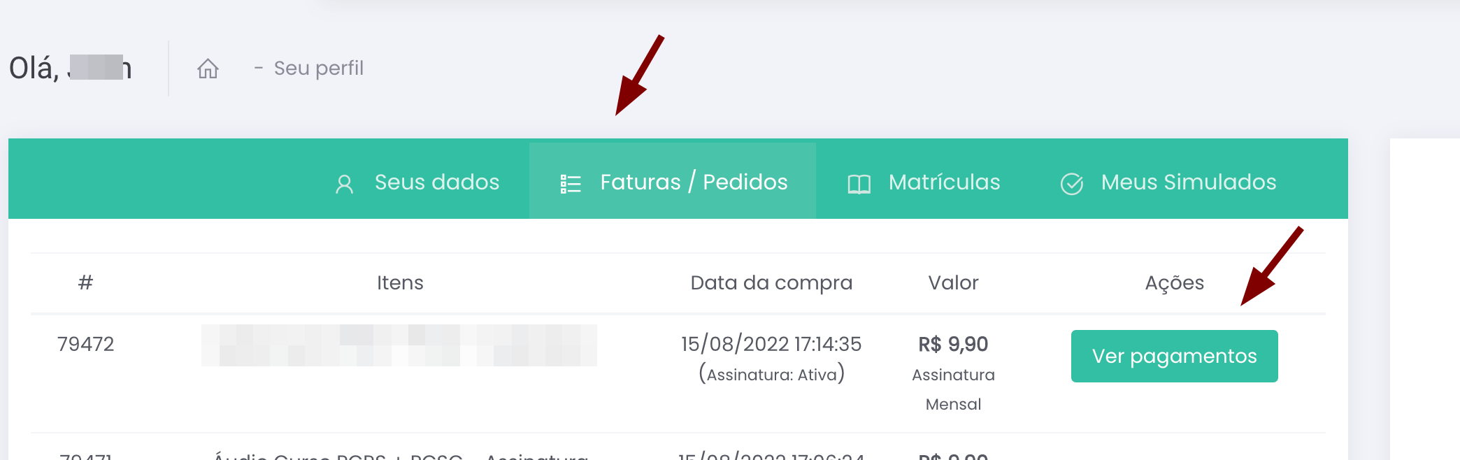 Após isso, localize na sua lista de pedidos a sua assinatura e clique no botão Ver pagamentos, conforme imagem abaixo.