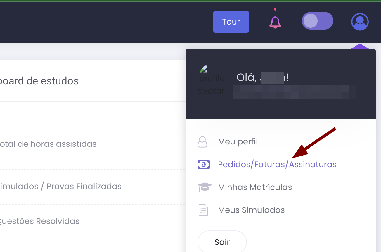 Clique na sua foto e depois clique em Pedidos / Faturas / Assinaturas, conforme imagem abaixo.