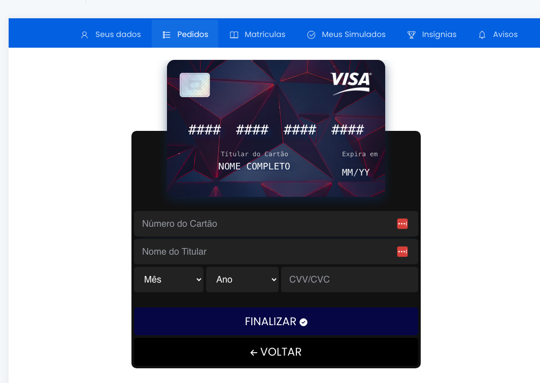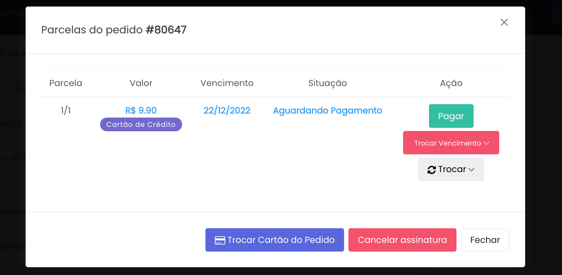 Após clicar em Ver pagamentos, aparecerá a opção Trocar Cartão do Pedido, basta clicar e efetuar o cadastro do novo cartão de crédito.