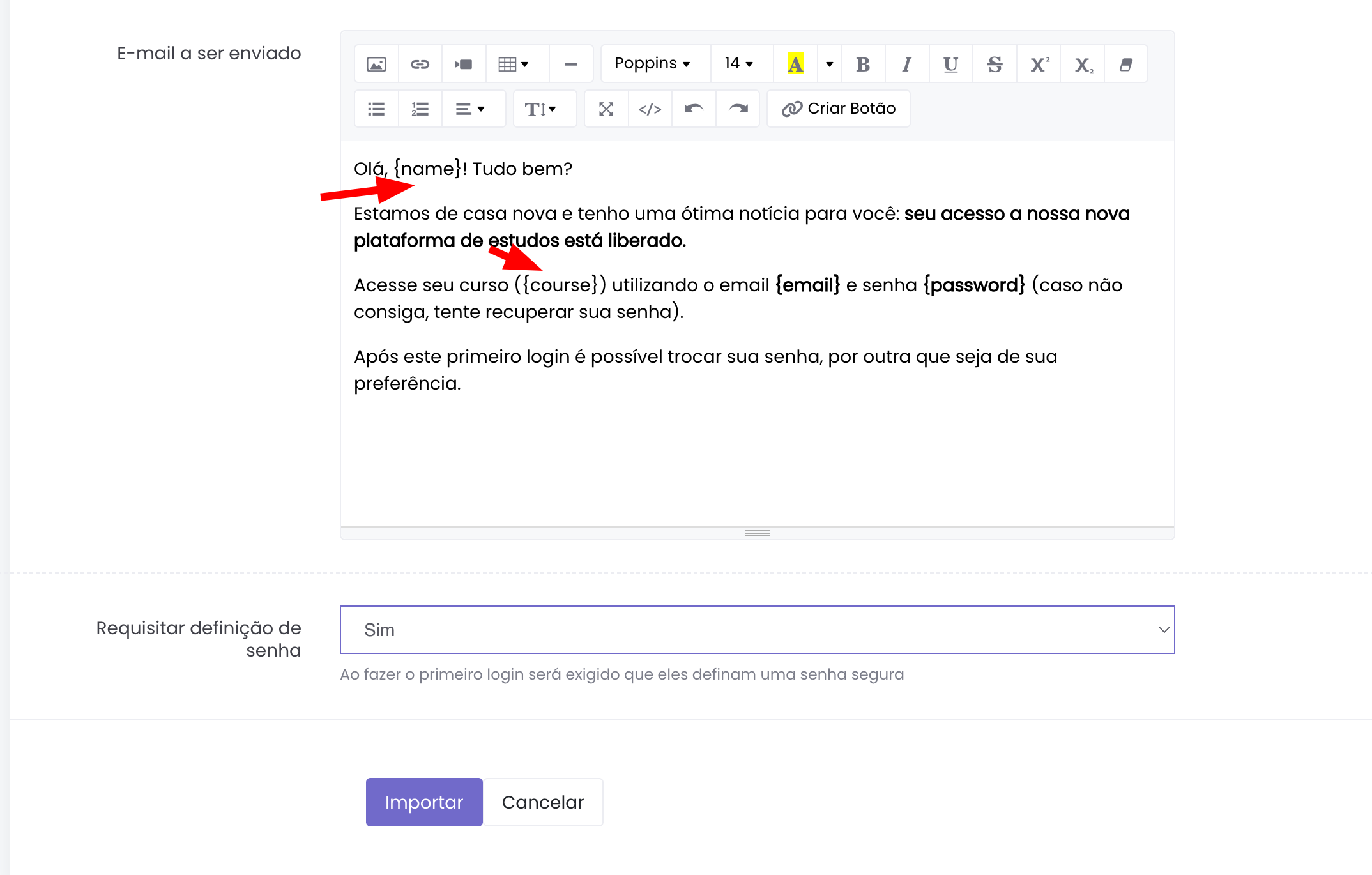 As palavras chaves que estão entre {} serão substituídas pelos valores (Ex: {name} = nome). Após o campo de edição do e-mail temos o campo Requisitar definição de senha, este campo serve para que ao importarmos os usuários, após o primeiro login deles eles devem definir uma senha própria e segura.