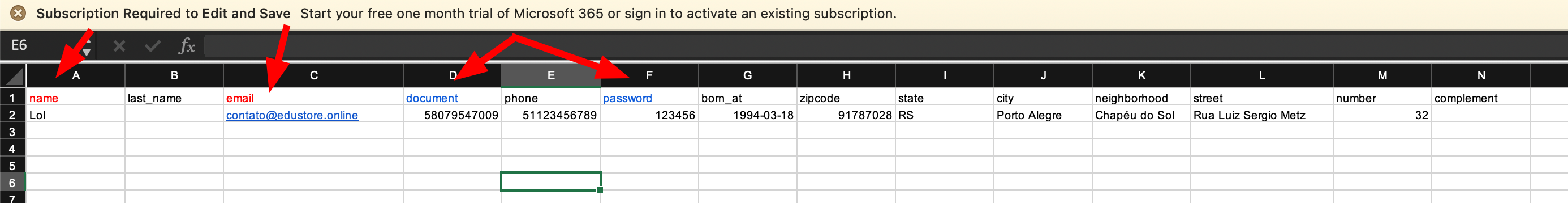 O modelo de excel exige algumas obrigatoriedades, os campos obrigatórios são: