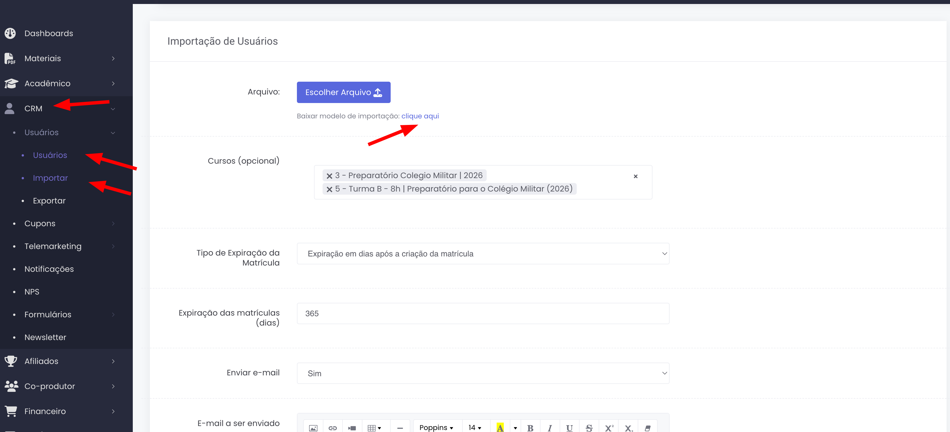 Podemos selecionar um ou mais cursos e definir o prazo se será em: dias após a data da matrícula ou uma data de expiração definida.